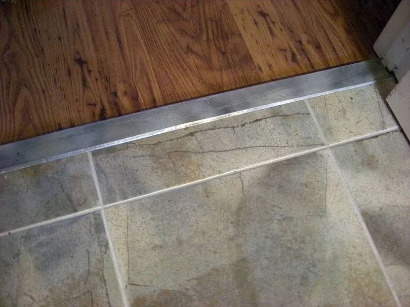 Металлический порожек между плиткой и ламинатом, закрепленный закрытым методом Источник pinterest.ru