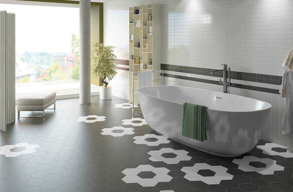Можно для облицовки стен выбирать шестиугольный кафель контрастных цветов. Пусть доминирует основной белый цвет, в него достаточно красиво вписываются штучные модули темного цвета.