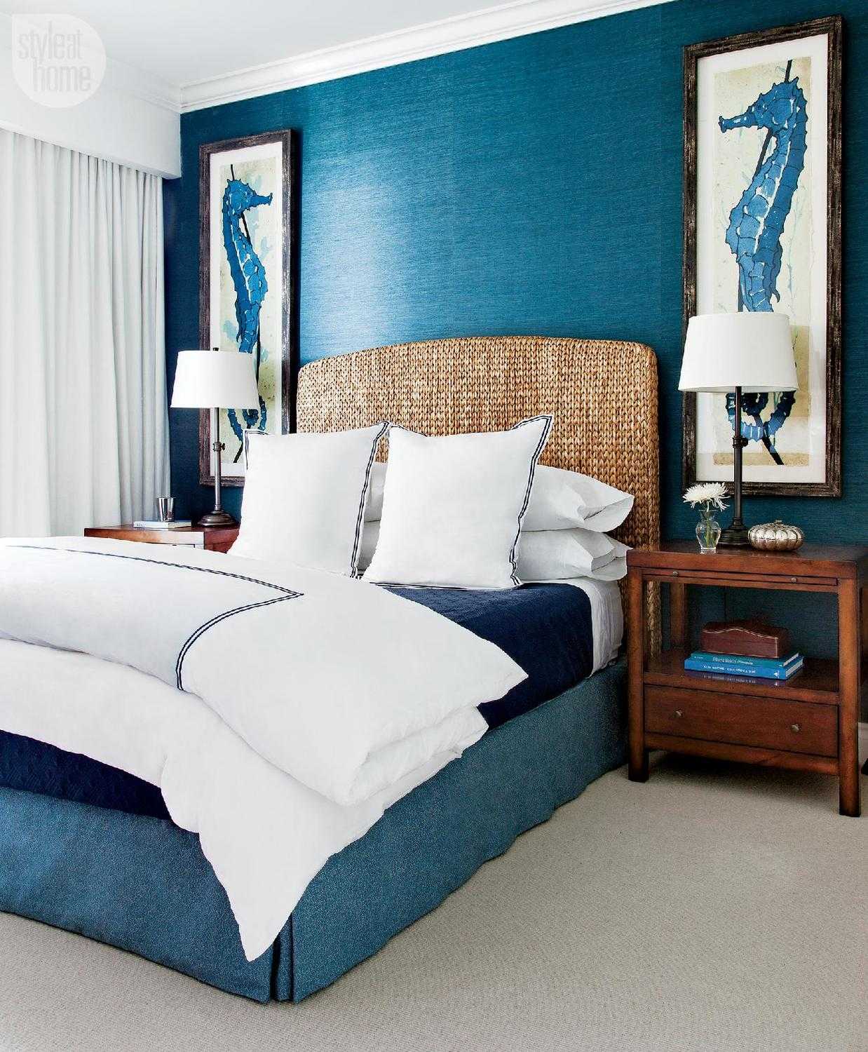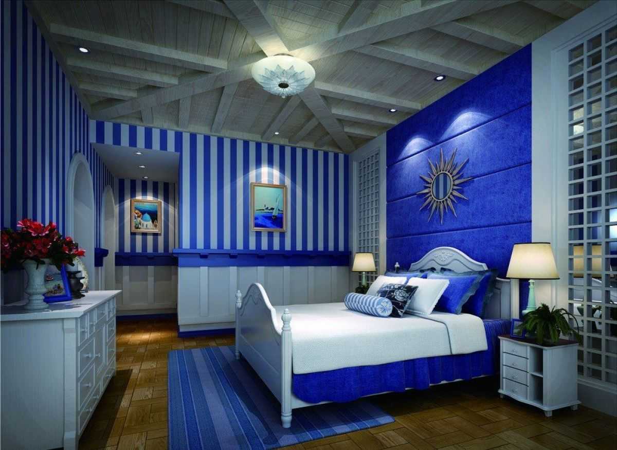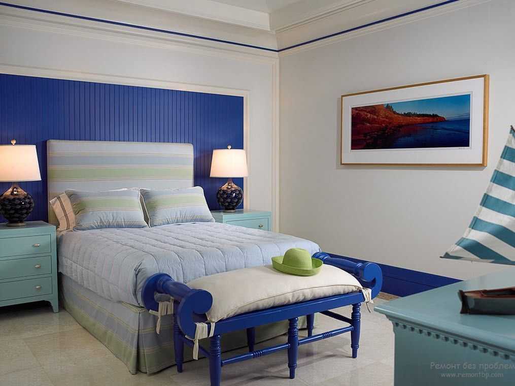 Синий цвет в большей мере напоминает о море, поэтому эта тематика актуальна при формировании спального интерьера. Сочетание белого и синего с большим использованием полос и тематических элементов способно перенести владельца спальни и его гостей в загадочное морское путешествие, полное приключений или на тихий пляж посреди океана. В такой комнате настолько приятно находиться, что будет сложно отказаться провести здесь вечер после длинного рабочего дня или побыть в постели подольше с утра.