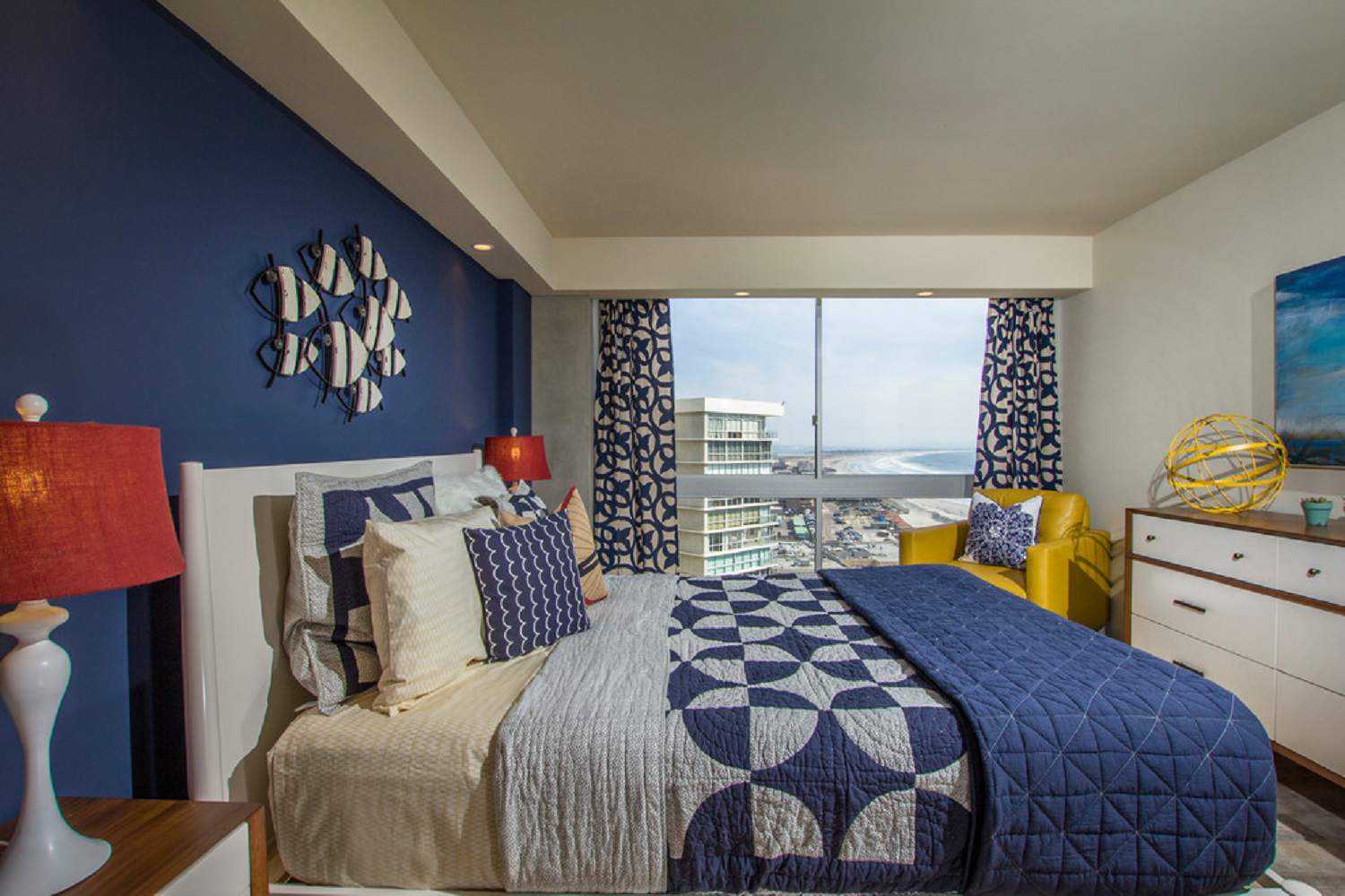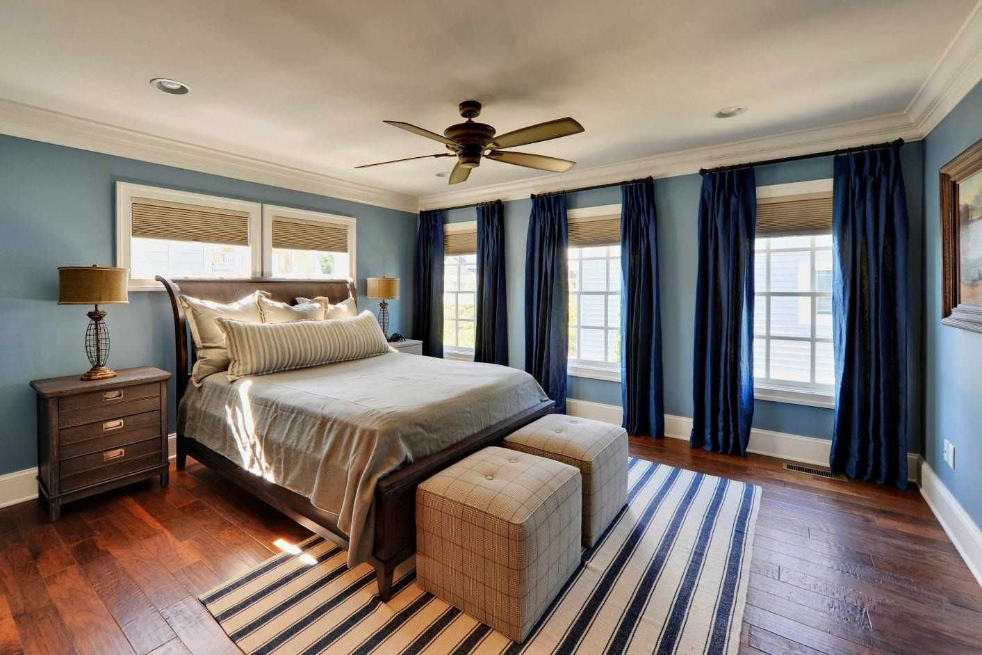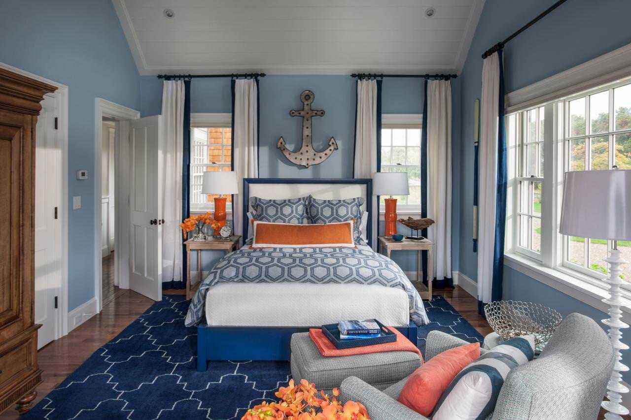 Синий цвет в большей мере напоминает о море, поэтому эта тематика актуальна при формировании спального интерьера. Сочетание белого и синего с большим использованием полос и тематических элементов способно перенести владельца спальни и его гостей в загадочное морское путешествие, полное приключений или на тихий пляж посреди океана. В такой комнате настолько приятно находиться, что будет сложно отказаться провести здесь вечер после длинного рабочего дня или побыть в постели подольше с утра.