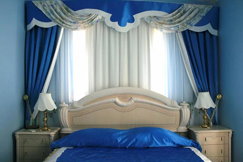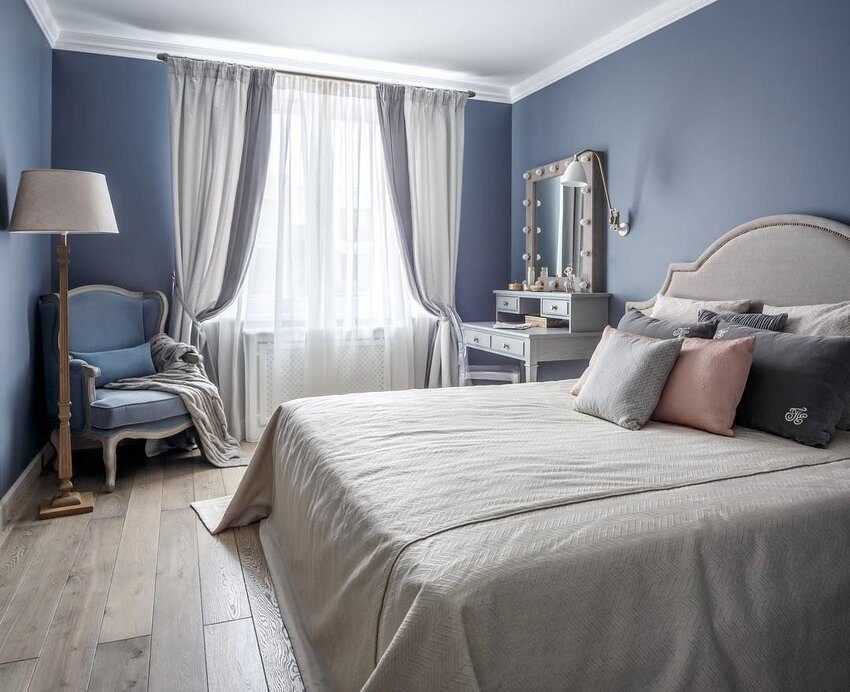 Голубые стены позволяют экспериментировать со шторами в интерьере. С ними хорошо будут смотреться как прямые синие шторы, так и светлые, украшенные легкими узорами с добавлением белого тюля. Последний вариант — универсальное решение для любой голубой спальни.