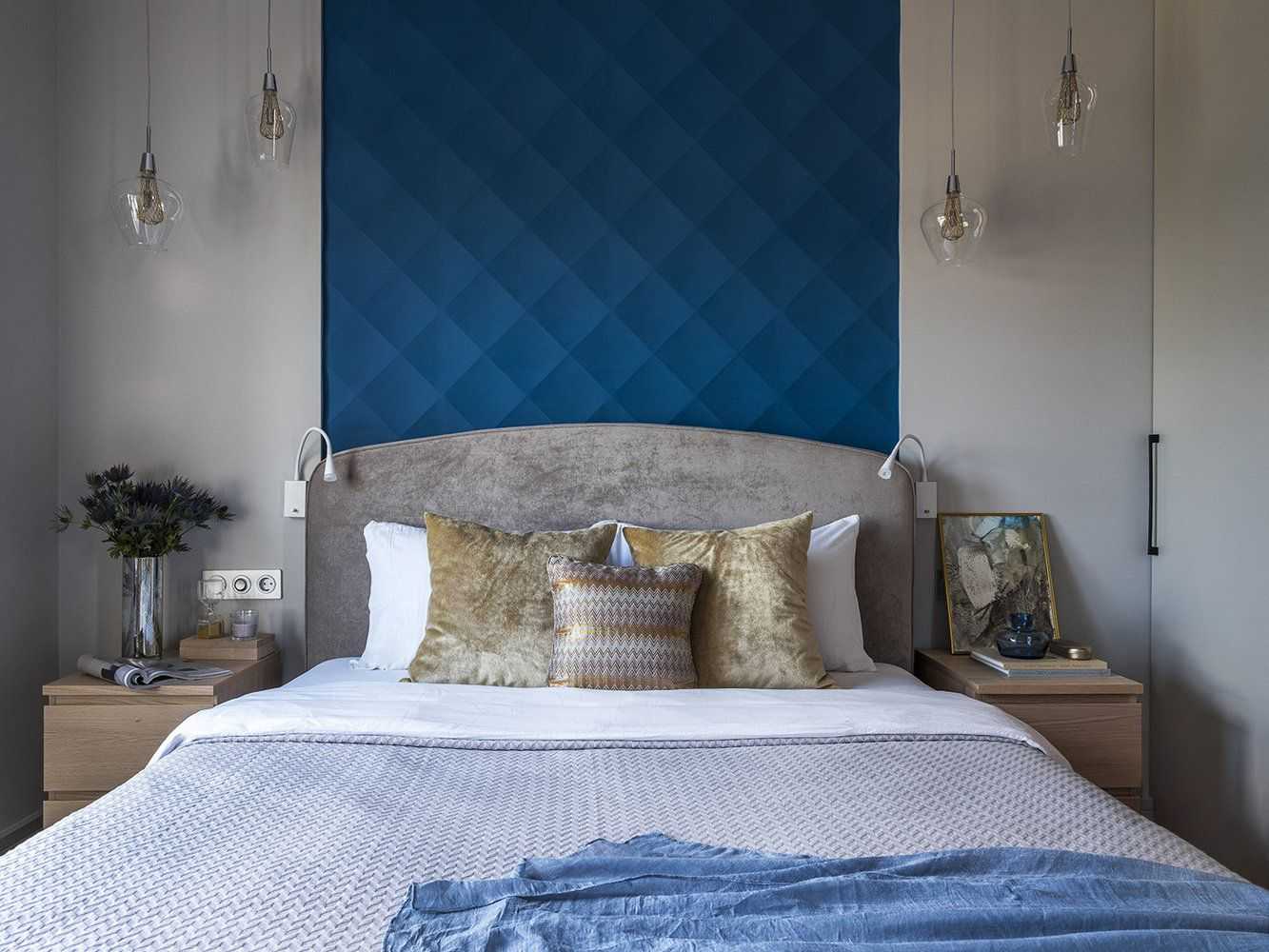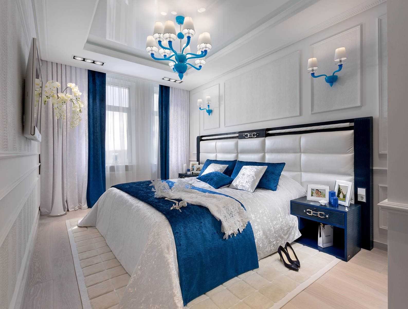 Любой оттенок синего будет эффектнее смотреться при правильно подобранном освещении. Кроме верхнего света (люстр и потолочных светильников), здесь будут уместны торшеры, настенные бра или лампа на столе. Каждый из источников света поможет сделать акцент на отдельной части спальни. К примеру, с помощью бра, будет удобно почитать любимую книгу перед сном.