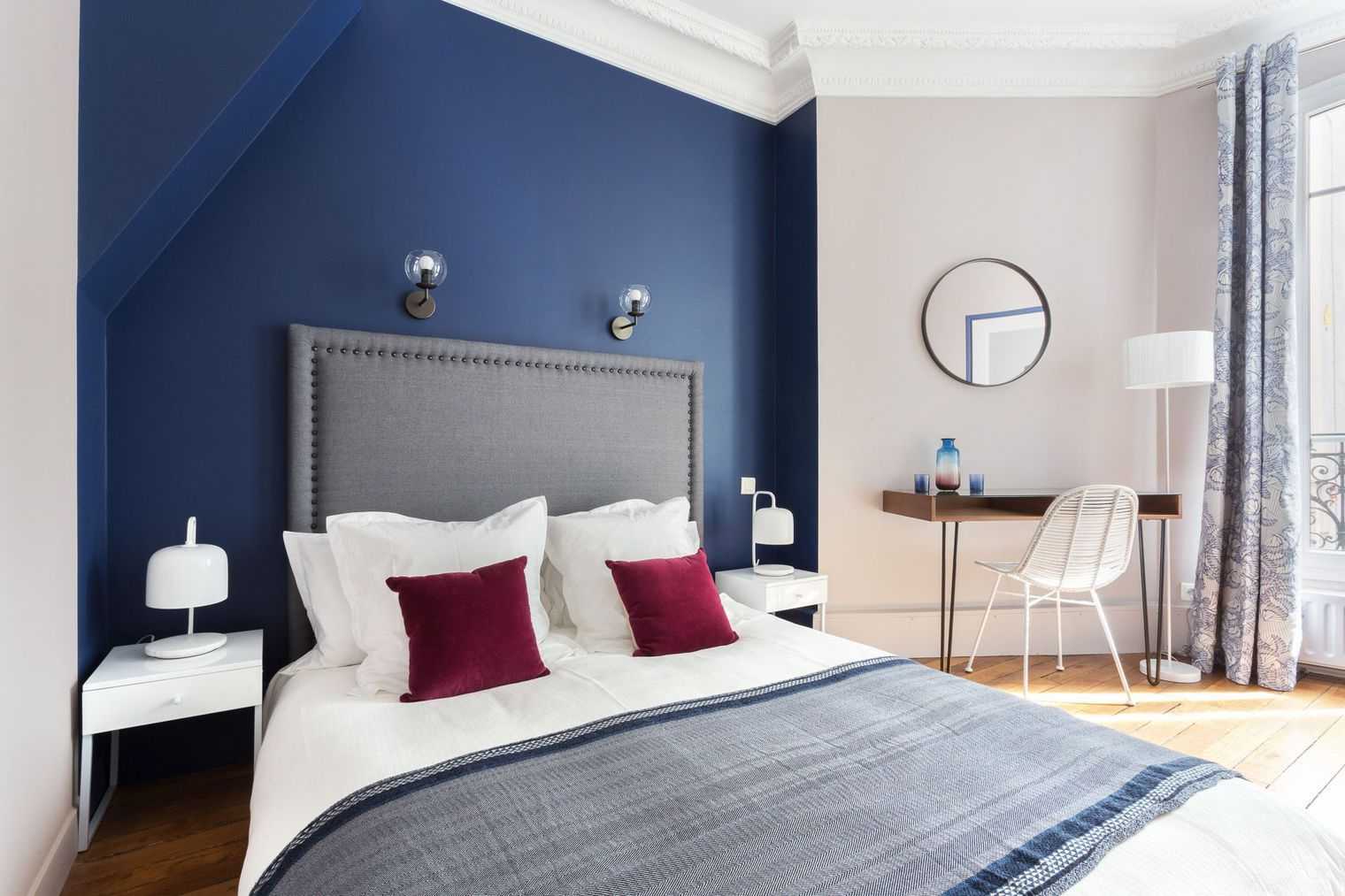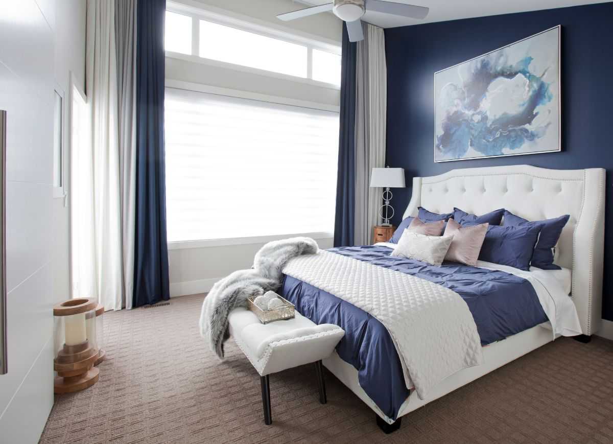 Синий цвет в интерьере спальни выглядит особенно благородно. Он не только подчеркивает эстетическую составляющую, но и часто является акцентом оформления. Кроме того, выбирая такое нетипичное решение, вы сделаете значительный вклад в собственный качественный отдых.