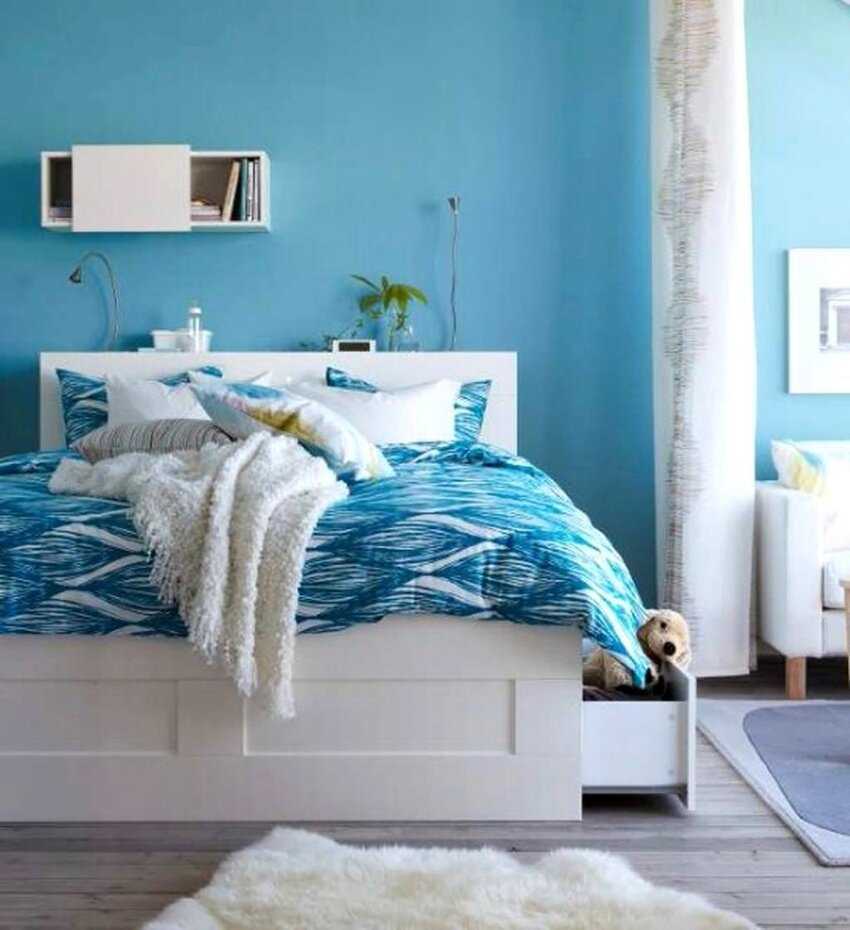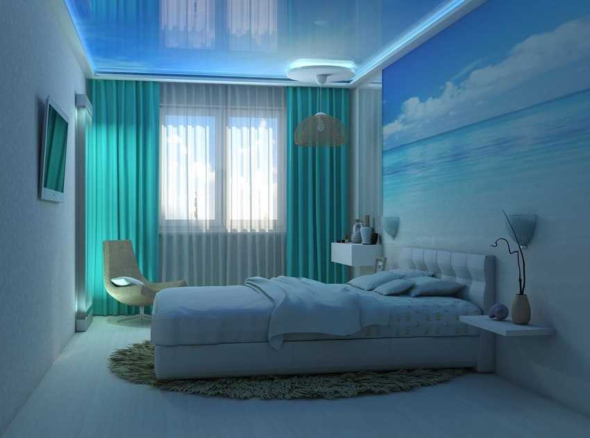 Как правило, именно эти поверхности становятся наиболее яркими в комнате. При помощи обоев аквамаринового или голубого тонов можно сделать помещение визуально шире. Однотонные стены можно украсить подходящими к стилистике спальни картинами или фотообоями. Если планируется создать морской интерьер, уместными будут изображения острова с пальмами или побережья океана.