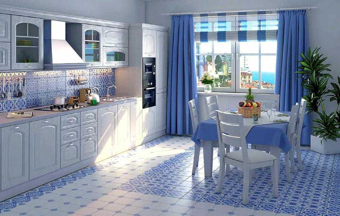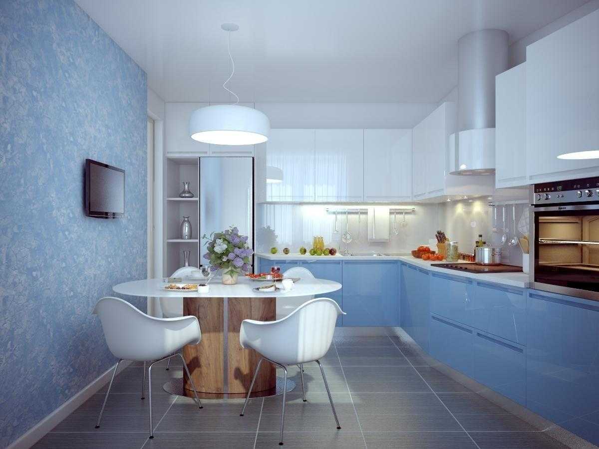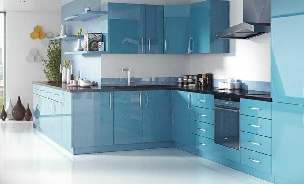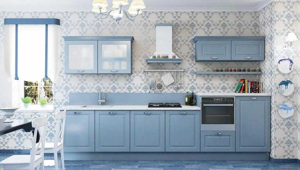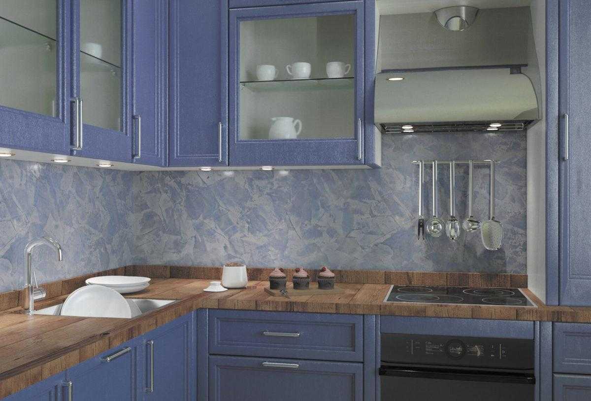 С помощью стен и потолка создаётся основа для голубого фона. Обычно они окрашиваются в белый цвет, но возможны варианты. Главная задача – подобрать подходящую палитру и качественные отделочные материалы. Для облицовки стен на кухне, используются следующие строительные позиции: