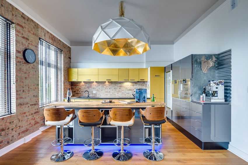 Для обустройства кухни-гостиной лучше всего выбирать стиль лофт, который поможет раскрыть весь потенциал подобного помещения. Основные принципы такого интерьера — это соседство современных фактур (стали и стекла), с голыми кирпичными стенами и грубым деревянным полом. В обычной городской квартире кирпичную кладку можно сымитировать, используя некоторые декоративные материалы.