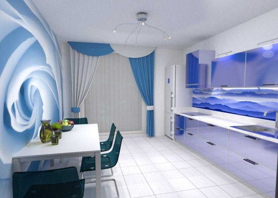 Когда основным цветом для кухни был выбран синий и интерьер получился довольно насыщенным и глубоким, то шторы стоит выбирать более светлых оттенков. Это поможет избежать мрачности и угрюмости, внести в помещение воздушности и гармонии. В качестве наиболее применяемых оттенков служат следующие: