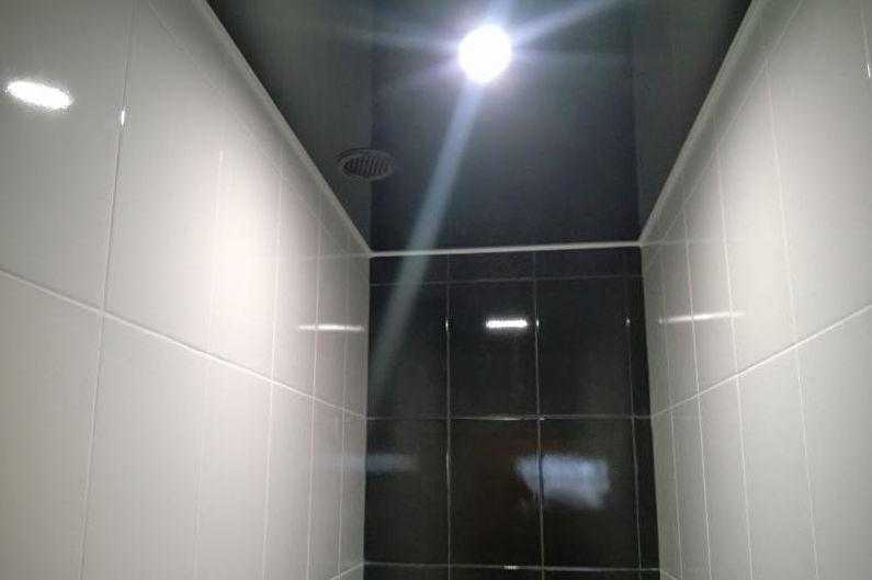 Натяжной потолок не боится влаги, за ним легко следить, может быть глянцевым и отражать свет, представлен в широком ассортименте. Для маленького интерьера туалета лучше подобрать одноуровневое полотно.
