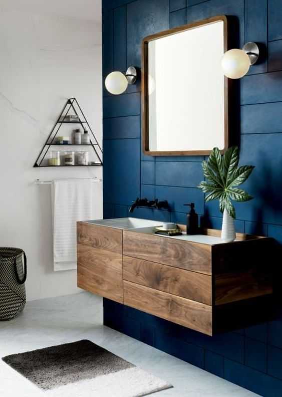 Если ванная асимметричная, самую длинную стену можно полностью оформить в синий цвет, а остальные сделать светлыми. Такой прием с акцентной стеной поможет сделать комнату визуально более симметричной и добавит яркости интерьеру.