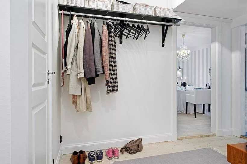 Если ни один из перечисленных выше способов вам не подходит, можно вообще не использовать шкафы. Самый простой вариант – это размещение непосредственно на стене полки с крючками для верхней одежды и компактной подставки для обуви.