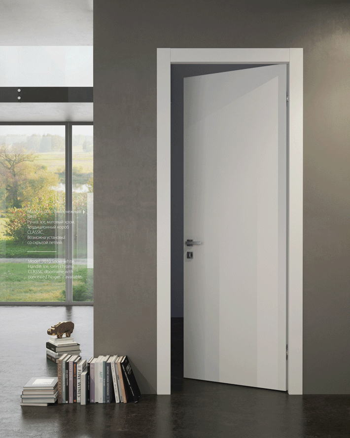 Суть конструкции – обычная дверь, но со специфической рамой и петлями. Необычное устройство дверной коробки предназначено для установки дверного полотна в единой плоскости со стеной. Наличник отсутствует. Проем можно «замаскировать», окрасив полотно в цвет стен или придав схожую текстуру.