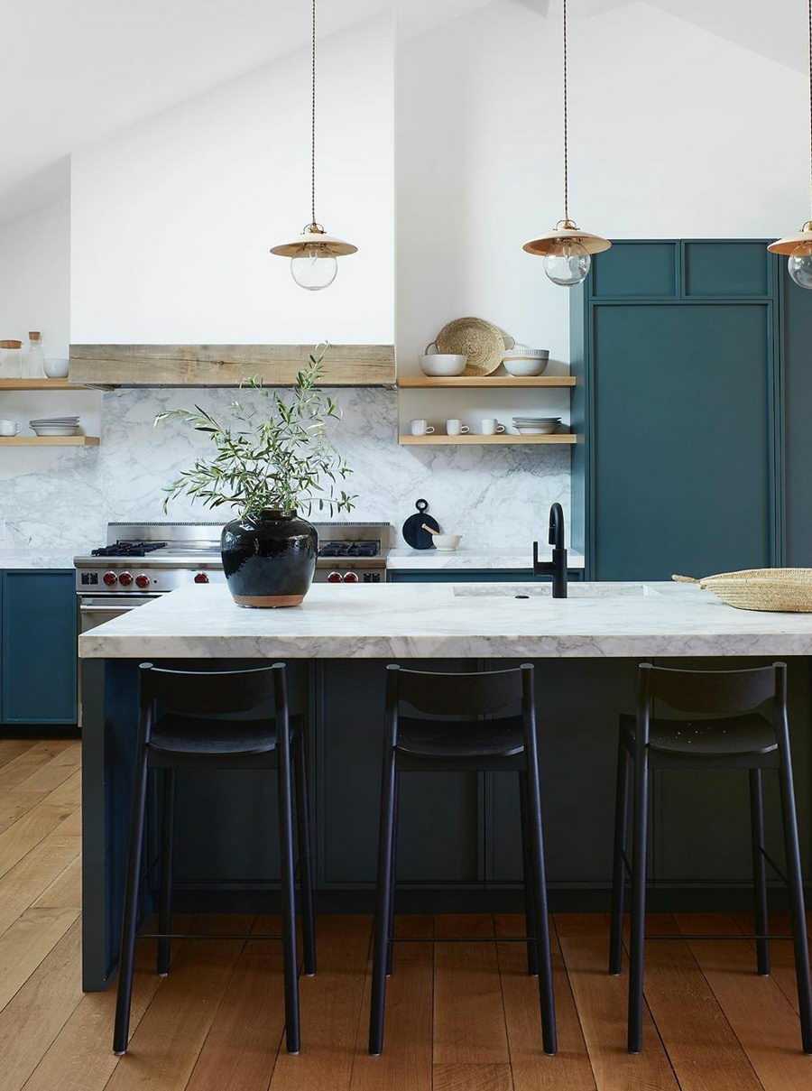 Модный тренд 2019-2020 для кухни – это морская стилистика. Фартук и столешницу оформите в сером или белом. Установите синюю кухню с медной фурнитурой.