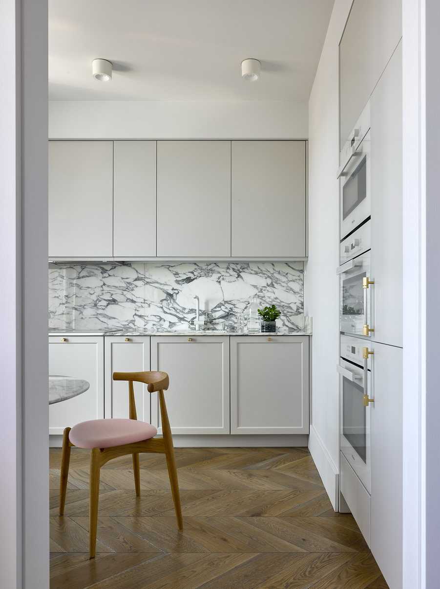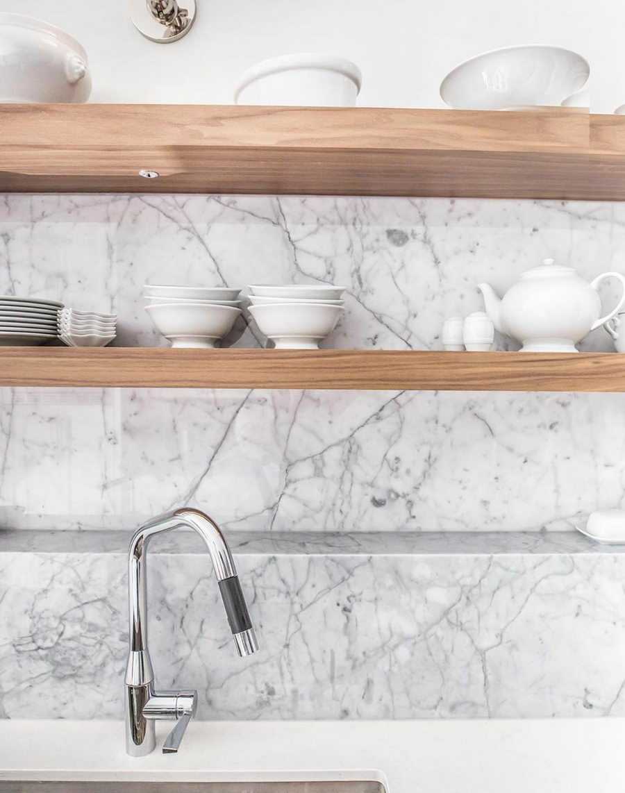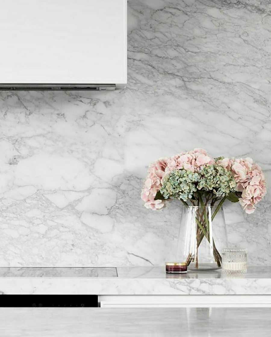 Хотите создать кухню в стиле минимализм? Оформите белый фартук из мрамора и добавьте в интерьер серые аксессуары.