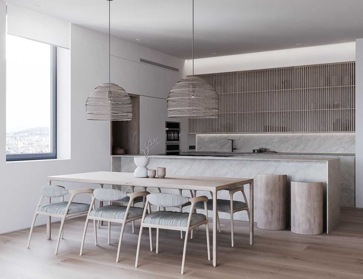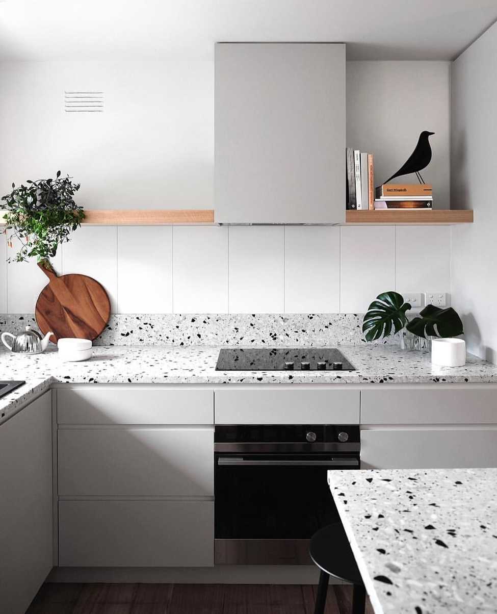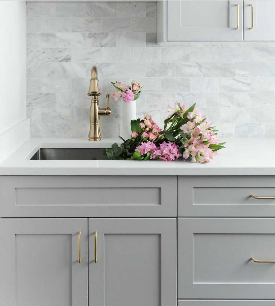 Хотите создать кухню в стиле минимализм? Оформите белый фартук из мрамора и добавьте в интерьер серые аксессуары.