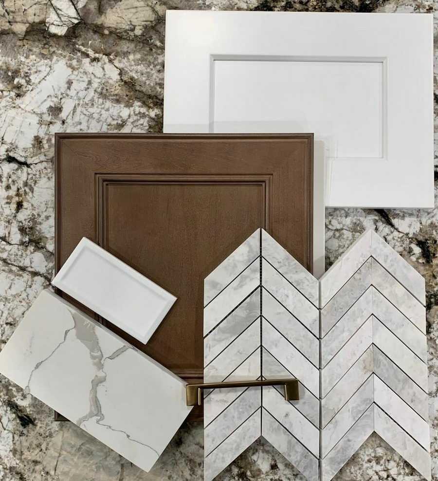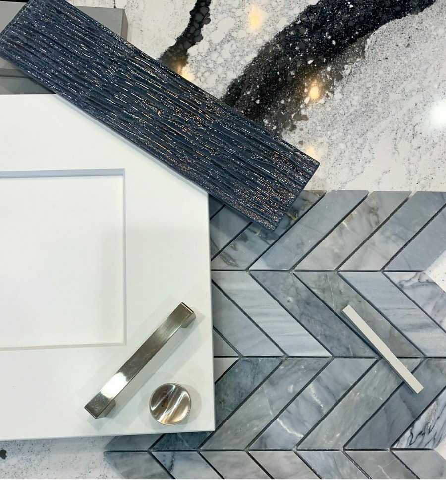 Тут можно сказать тоже, что и об отделке стен камнем. Если у вас фартук из мрамора, то подбирайте мебель или пол под цвет его прожилок.