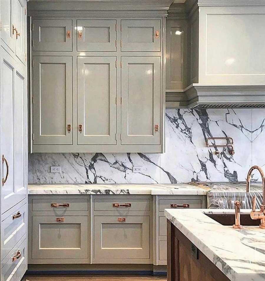 Очень модным в 2019-2020 году будет столешница и фартук серо-белого мрамора. Попробуйте воплотить это решение в жизнь, и ваша кухня будет выглядеть утонченно и аристократично!