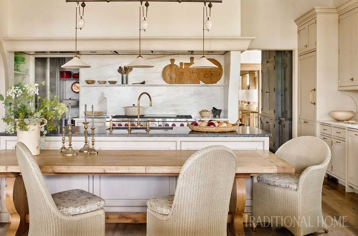 Дерево и белый цвет — это всегда выгодное сочетание. В этой кухне дерева много: это и обшивка фартука деревянными панелями, и вытяжка, и деревянные аксессуары. Дополняет стиль кантри соответствующий декор: медные приборы, деревянные доски, керамика и живые цветы.