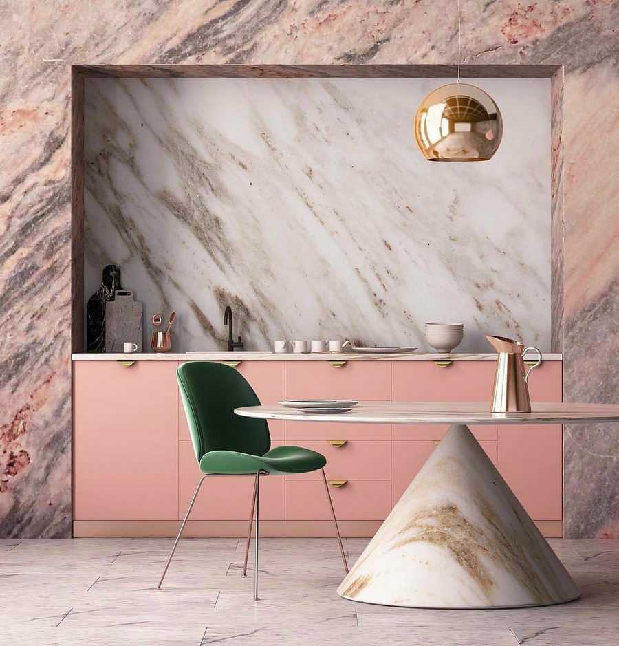 - Розовый терракот. Фартук из мрамора такого цвета отлично смотрится с кухней с открытыми стеллажами, деревянными шкафами и столешницей из мрамора.