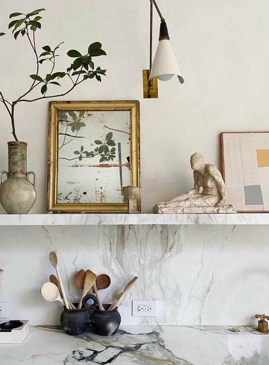 Если свободных горизонтальных поверхностей нет, мраморный декор вешают на стену: в виде часов, рам для картин или зеркал, панно.