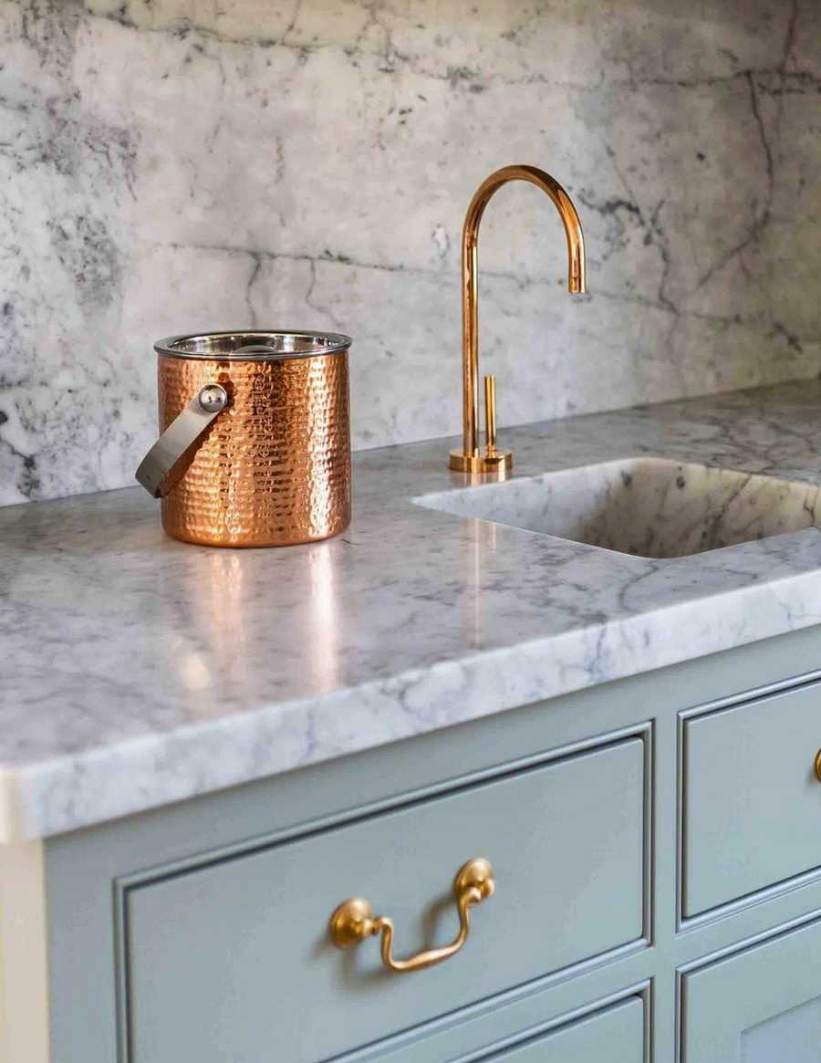 Реже мрамор используется для фасадов мебели — но стоит признать шкафы с «мраморными» дверками выглядят эффектно!