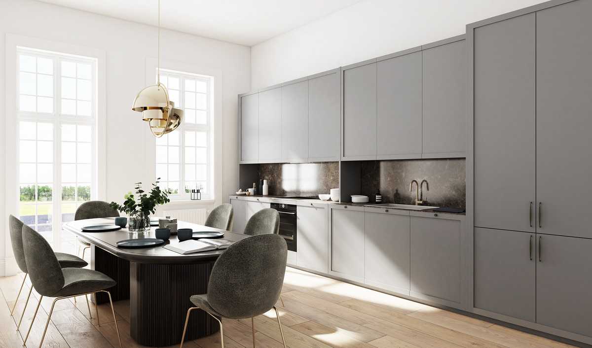 В кухне всегда стильно смотрятся оттенки благородного серого. Шкафы в графитовых тонах гармонируют с белым фартуком из мрамора и такой же столешницей. Хотите добавить акцентные нотки? Выберите черный смеситель.