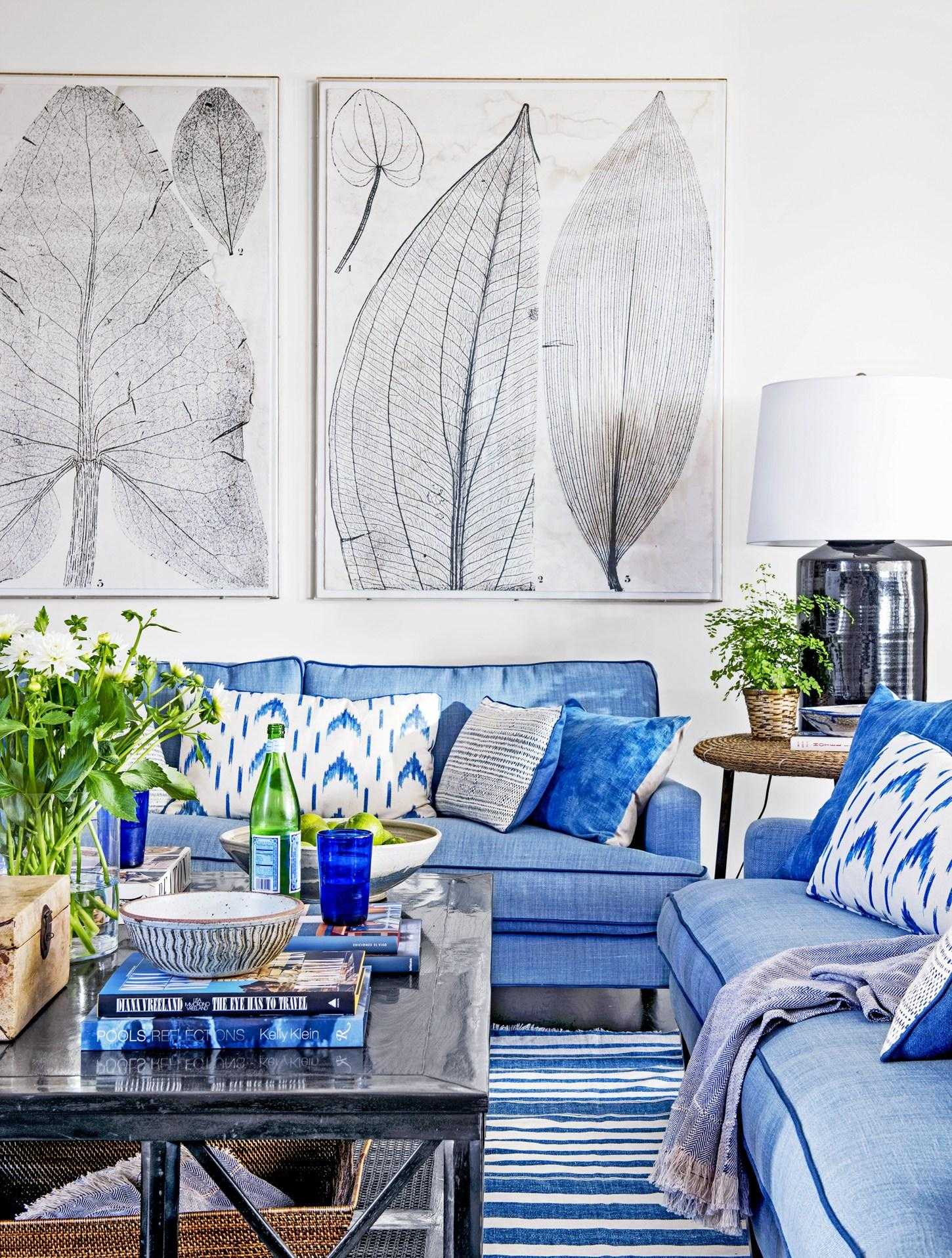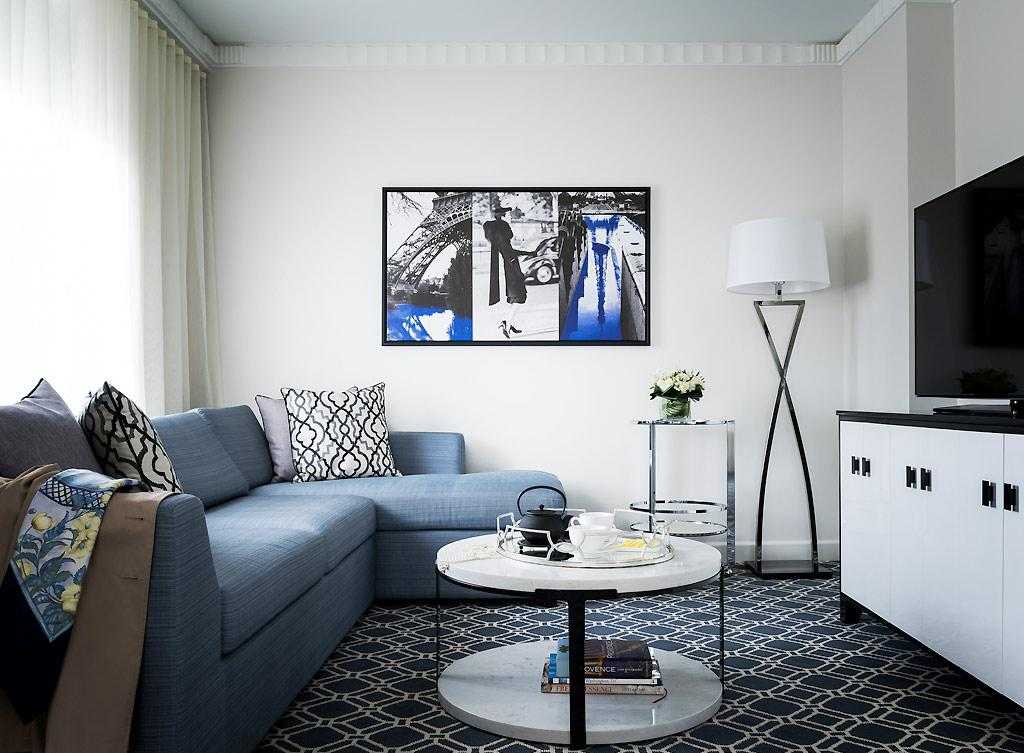 Классическим считается сочетание голубого с белым. Оно подойдет даже для небольших комнат. Чтобы интерьер не стал однообразным, можно добавить аксессуары пастельных оттенков – бежевого, розового, лимонного.