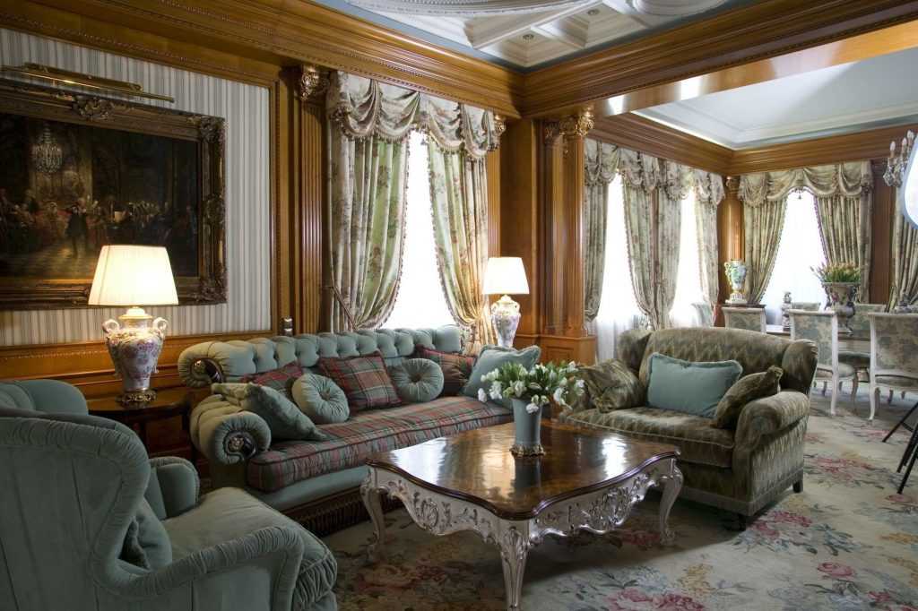 - окна украшают шторы или портьеры из тяжелых видов ткани;
