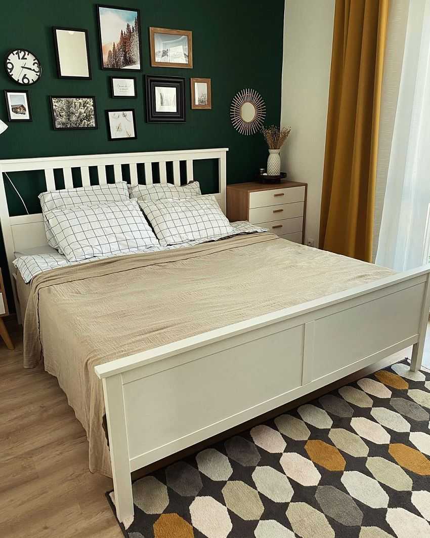 Изумрудный оттенок сделает дизайн спальни роскошным и изысканным. Его можно использовать в отделке стен и потолков.