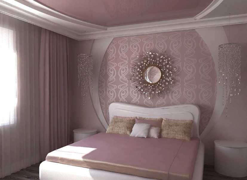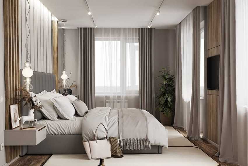 Дизайн выбирают исходя из расположения двери. В узкой спальне-вагончике, где дверь находится на короткой стороне, стену напротив делают темнее. Если дверь по длинной стороне, обе короткие можно увеличить при помощи горизонтального рисунка.