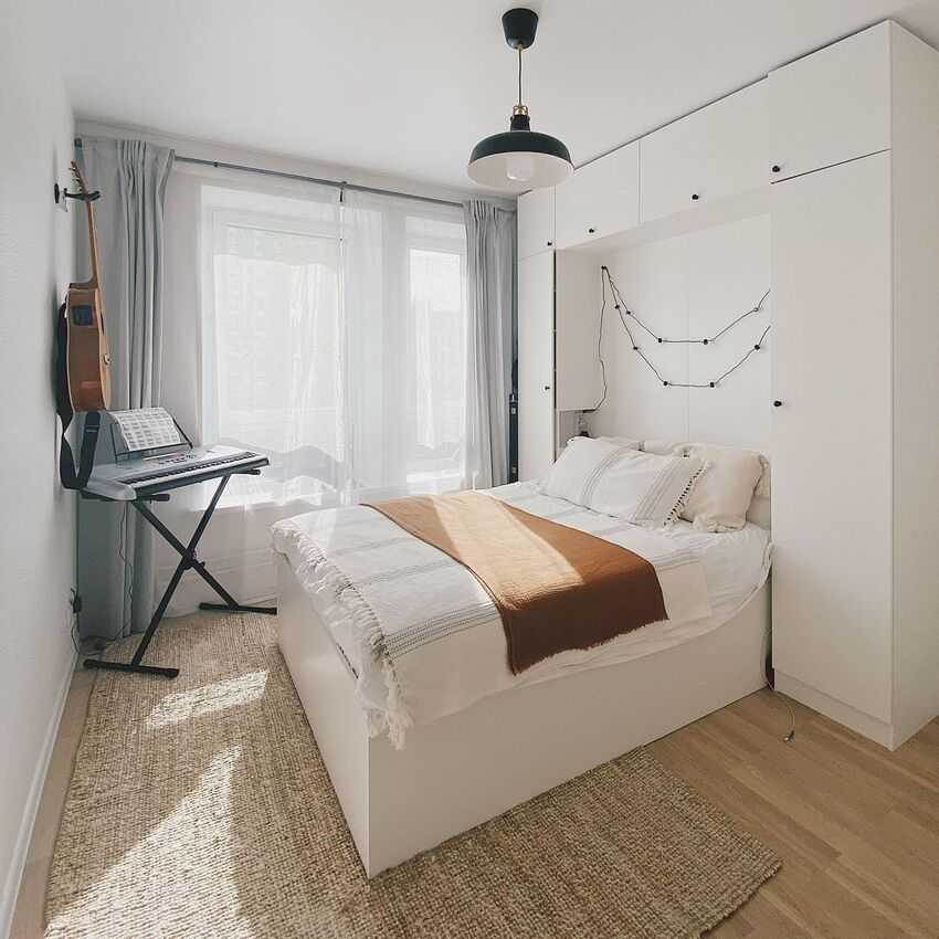 Для отделки маленькой спальни следует выбирать светлую цветовую палитру, которая поможет визуальному увеличению пространства.