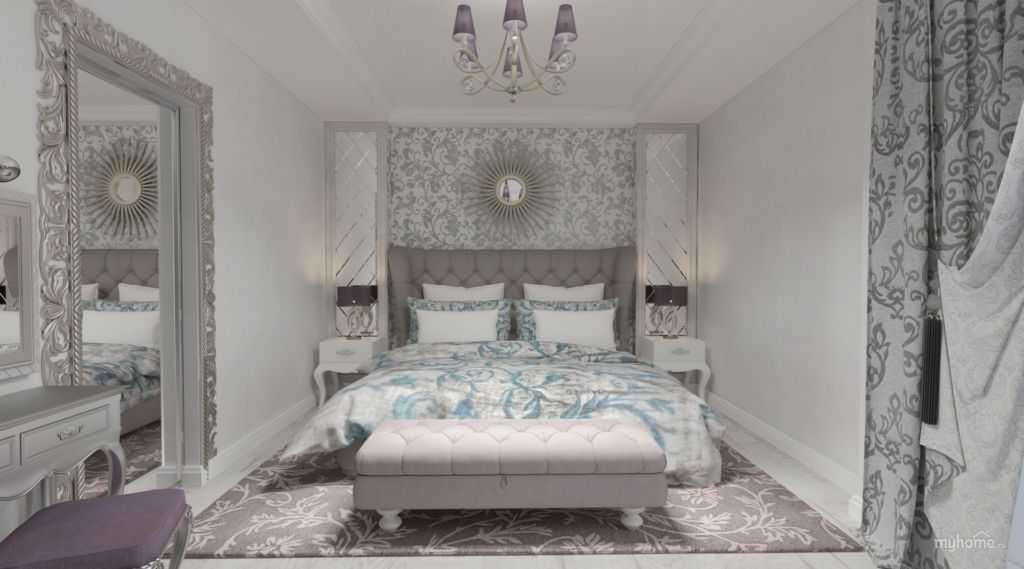 Роскошные черты приобретёт спальня, если в ней будут присутствовать элементы натурального серебра. Возможно, это будут детали, имитирующие данный метал. Приветствуется и позолота. Зеркальные поверхности лучше всего располагать на стене, которая идет вдоль кровати. Их фоном могут быть обои с выделяющимися вензелями.