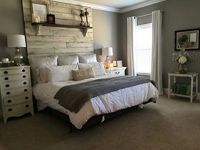 Декорирование стены у изголовья кровати в сером интерьере спальниИсточник decorationinfo.ru