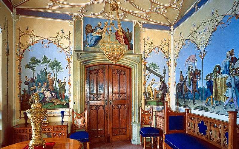 Туристов пускают почти во все помещения. Большой Зал лебединого рыцаря поражает внутренним убранством – картинами, барельефами и фресками на тему местного фольклора. В спальне королевы выставлена турецкая мебель, а в гостиной её Величества Марии на стенах изображен быт старинной крепости. Отдельно будет интересно посетить комнату Гогенштауфенаю. Здесь стоит старинное кленовое фортепиано, на котором сам Вагнер играл свои лучшие произведение королю Людвигу II.