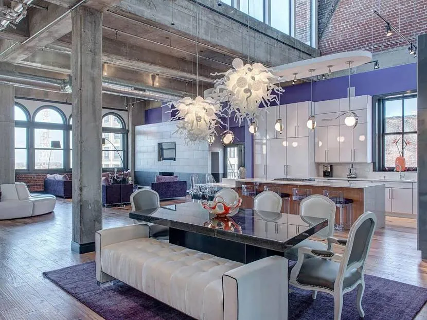 Гламурный. Впечатляющий контраст создает небрежная промышленная отделка и изящная мебель в классическом или барочном стиле, новая, с роскошной отделкой. Интерьер дополнит дизайнерская люстра, возможно, с хрустальными, а не стеклянными подвесками.
