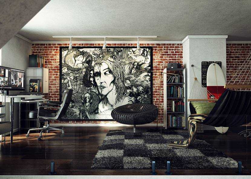 - Стен. Помимо неоштукатуренного кирпича подходит шероховатый бетон и деревянная обшивка.
