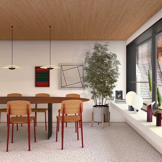 Подойдут подвесные люстры геометрической формы, напольные торшеры ярких цветов с длинными тонкими ножками, которые можно регулировать. А также настольные светильники на основании. Плафоны в виде конусов, цилиндров, шаров: средние и крупные.