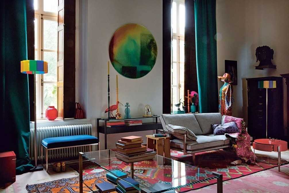 Текстиль выбирайте красочный. Шторы из натурального материала в пол с узорами в тон обоев. Яркие диванные подушки, круглые или овальные коврики.