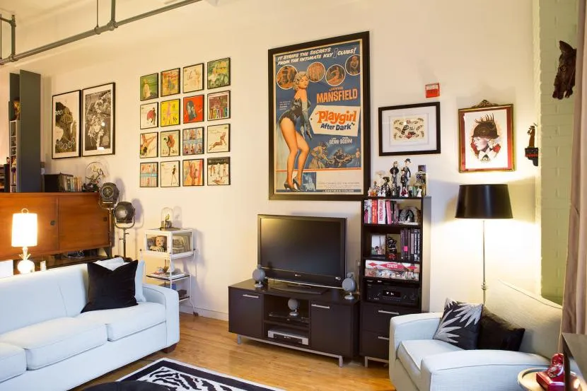 На стены повесьте необычные плакаты или картины, оформив их в красивые рамки. Также это могут быть стилизованные вырезки из газет, пин-ап постеры.