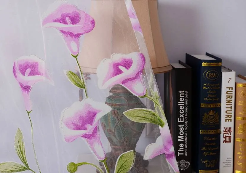Портьеры с этими благородными цветами в сочетании с легким тюлем создадут в спальне романтическую обстановку. В гостиной классического стиля можно украсить оконный проем тяжелыми портьерами, на которых изображены каллы, и однотонной гардиной.