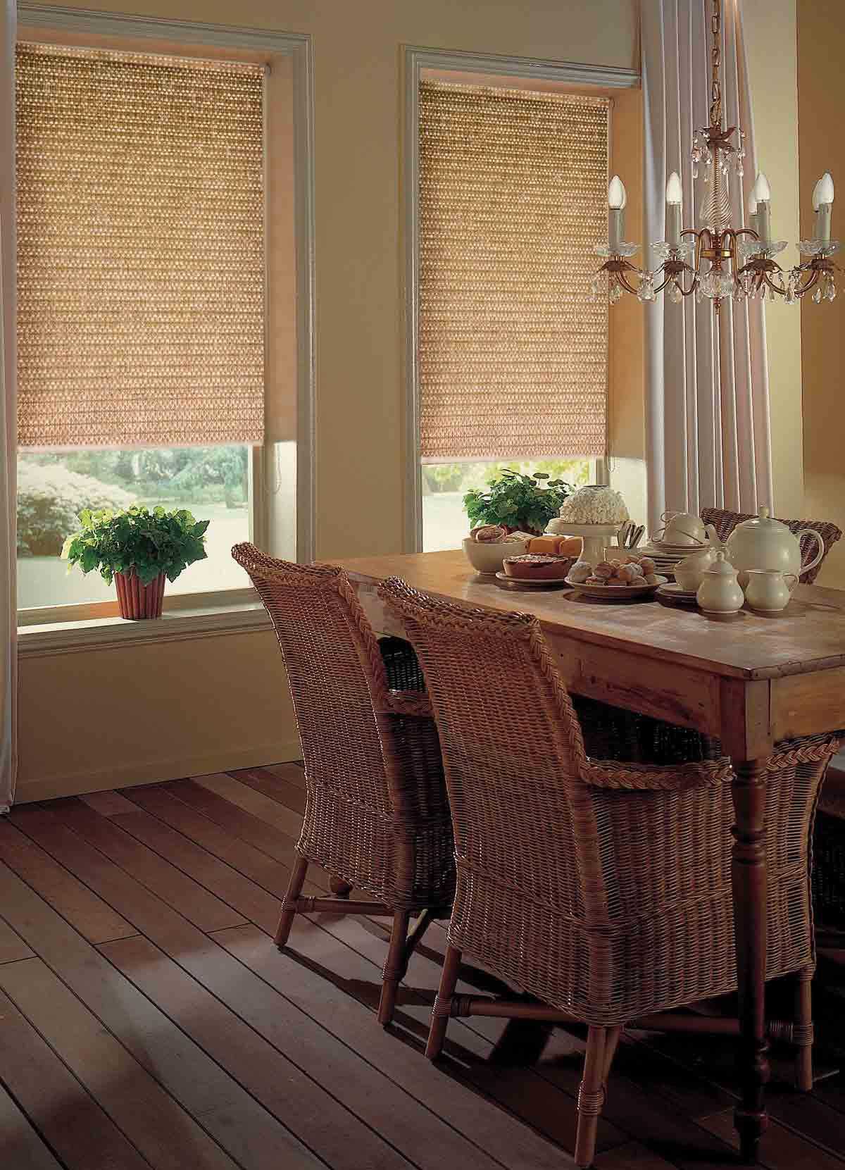 Занавески до подоконника в деревенском стиле в сочетании с римскими шторами