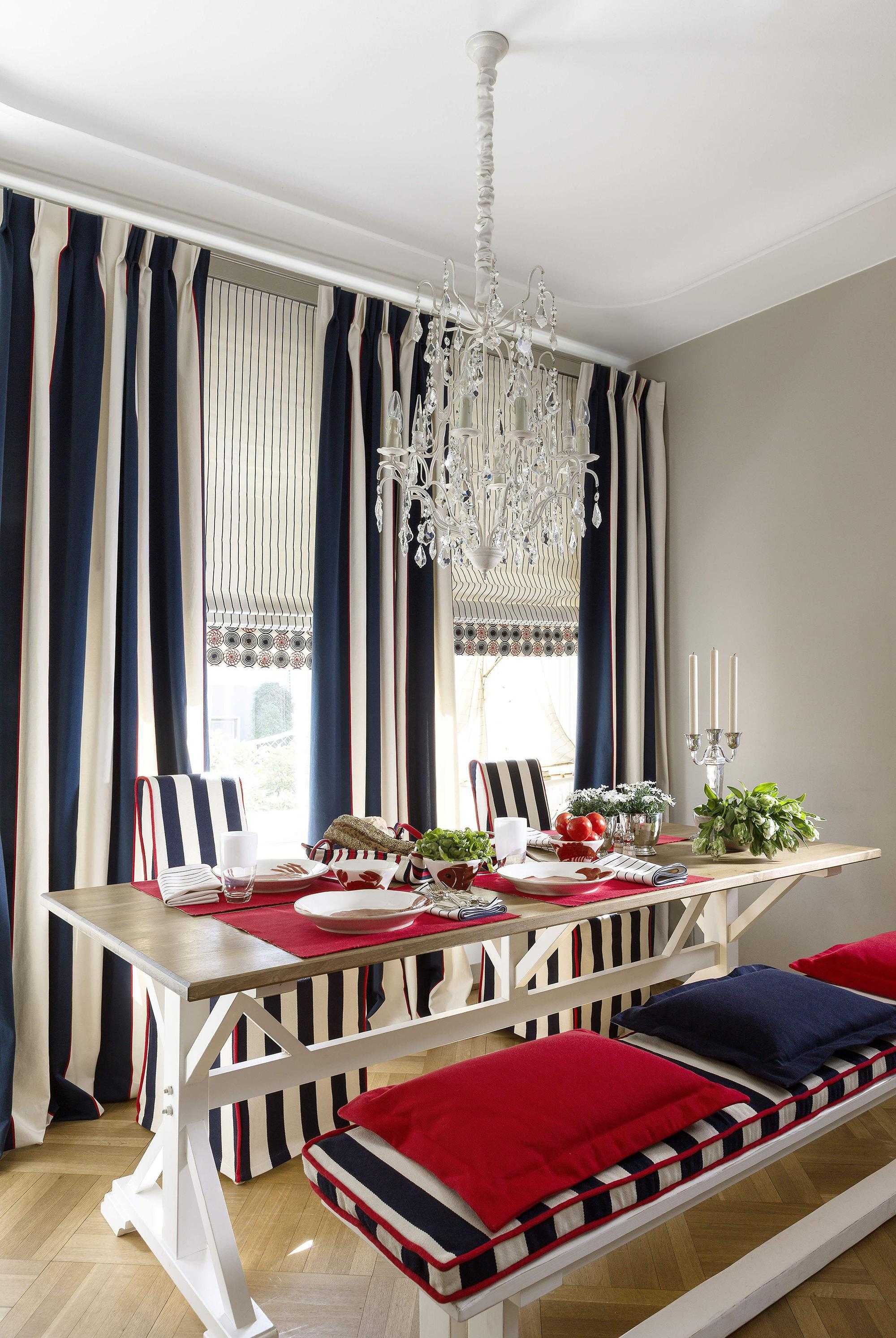 - Спокойный интерьер дополняйте шторами с рисунком или вышивкой, предпочтительно использование простых, «наивных» узоров — флористики, садовых плодов, либо клеток и полосок.