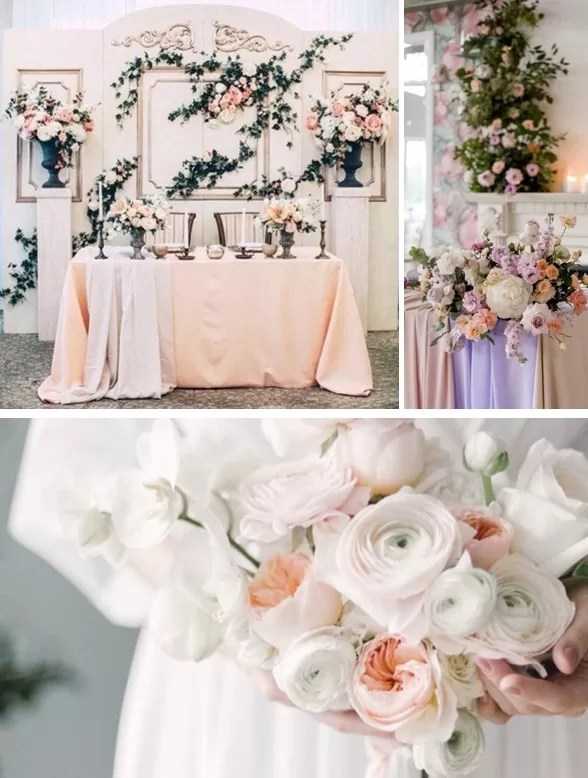 Светлые скатерти и салфетки из тонкого льна или хлопка, винтажные портьеры и чехлы на стульях. Обилие букетов и цветочных гирлянд из роз, ранункулюсов, пионов, гортензий, гиацинтов.