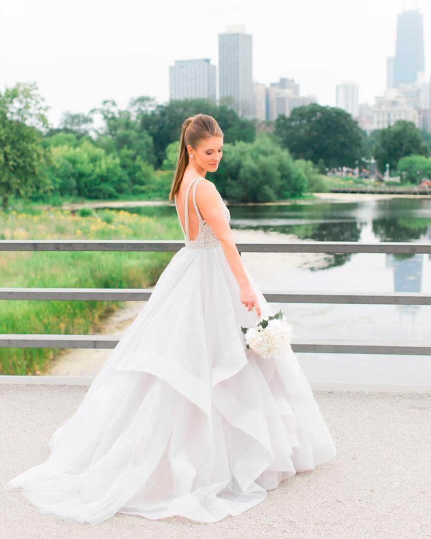 Я бы хотела платье припыленного серого или пудрового цвета с большими воланами на юбке, с элегантным вырезом на спине, на молнии или на пуговицах. Меряла, но подобных моделей не было, к сожалению. Сложность одна — лишний вес. Я не могу сказать, что у меня плохая фигура, но как и все невесты, я бы хотела выглядеть идеально. Недовольство собой мешает оценить само платье. Поэтому я решила повременить с выбором до “лучших” времен. Что касается свадебных туфель, то очень нравятся туфли Badgley Mischka, но я выбрала более классический вариант.