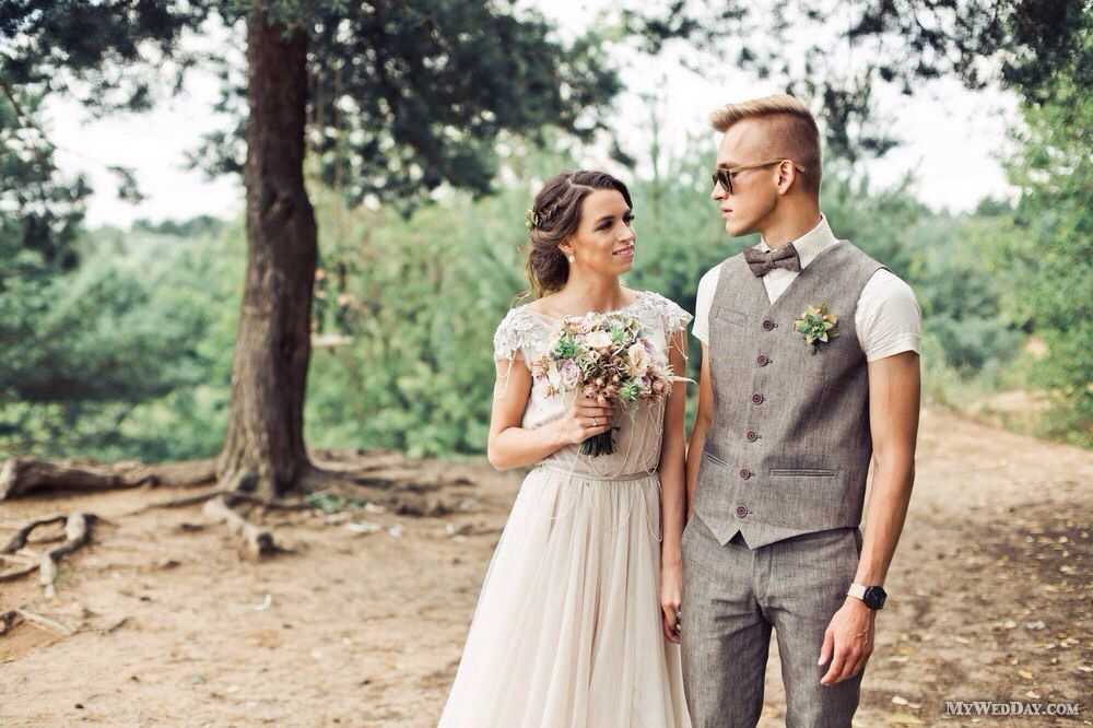 Невеста почувствует себя лесной феей в светлом романтичном наряде из струящихся тканей. Украшения могут быть абсолютно любыми – как обычными, так и из природных материалов.