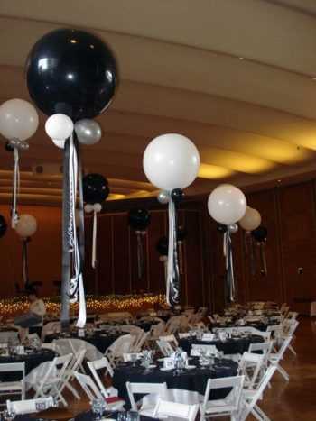 Украсить зал можно с помощью воздушных шаров, больших помпонов из бумаги или фатина, повторяющих основные цвета свадьбы.