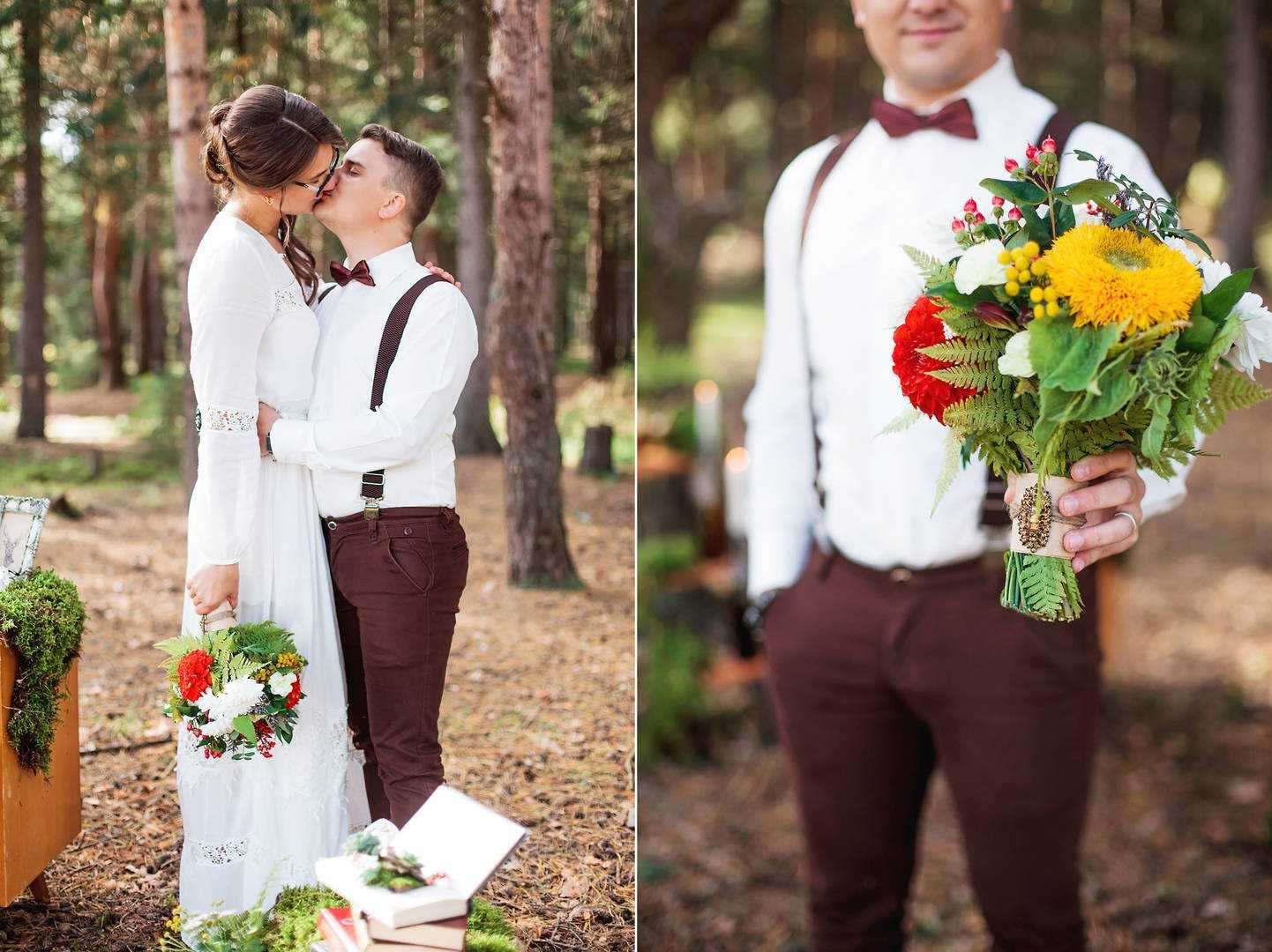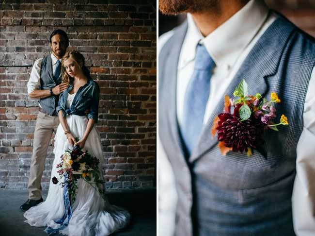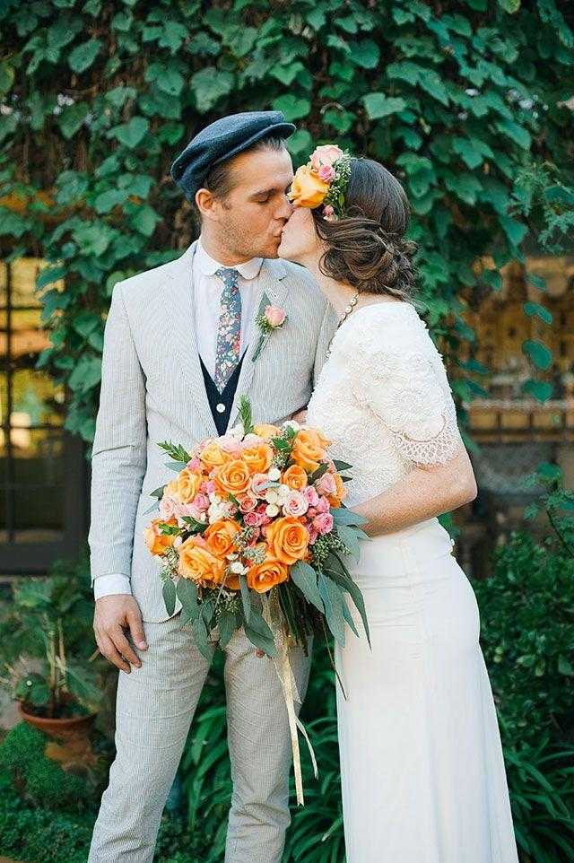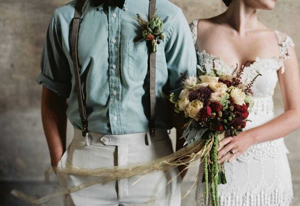 Жениху подойдёт рок или панк стиль или футболка с забавным принтом в сочетании с коротким пиджаком и бриджами. Вполне допустимы смелые цветовые сочетания.