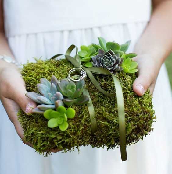 И какая «зелёная» свадьба без красивой подушечки для обручальных колец? Ты можешь выбрать символичный дизайн, который точно вызовет восторг и умиление у всех присутствующих: птичье гнёздышко или едва раскрывшийся бутон цветка! Красиво выглядит дубовый срез, подушечка из мха, и даже белое фарфоровое блюдце с оливковыми веточками – будто символ уважения к природе, поклонение её силе и красоте.