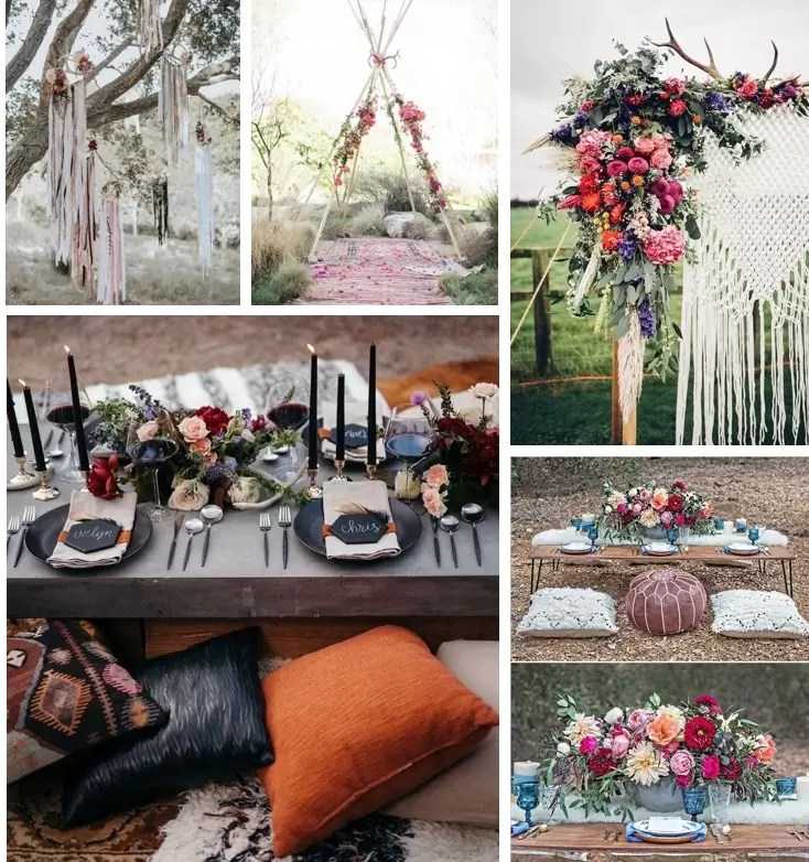 Отличительные особенности декора: Пампасная трава, ковры, перья, макраме, шали и пр.