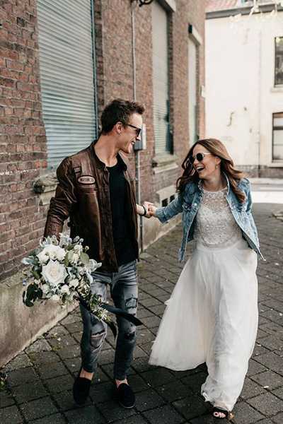 Гости, приглашённые на свадьбу в стиле урбан-шик или другие городские свадьбы, также могут выбрать свободный стиль в сочетании с тяжёлой или спортивной обувью и джинсой или искусственной кожей. Кстати, очень выгодно смотрятся коктейльные платья с кроссовками.