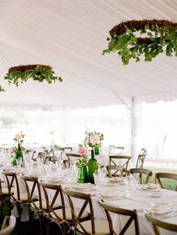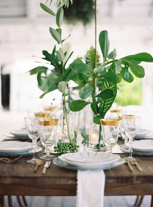 Даже простые деревянные стулья или стеклянные вазы с зелёными венками моментально превращают в красивые декоративные детали. Молодая зелень на банкетных столах органично смотрится с деревянными подсвечниками, столовым серебром, белыми свечами разных размеров и форм. Традиционные скатерти прекрасно заменят отрезы льняной ткани разной ширины, которые можно украсить лентами кружев. А можно и вовсе пренебречь правилами и расставить тарелки прямо на голые деревянные столы, что будет смотреться не менее выигрышно!